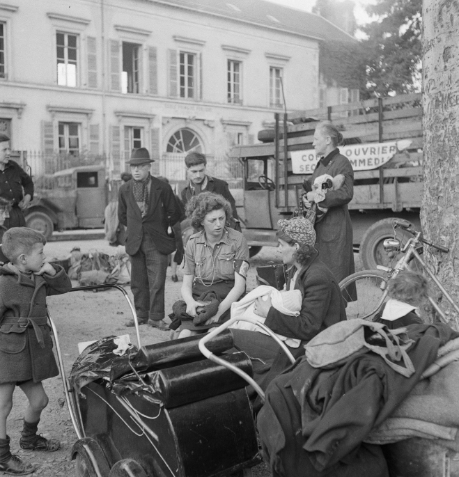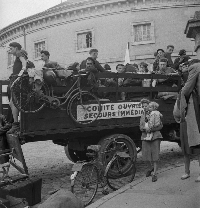 Les « réfugiés », selon le texte Normandie, terre de souffrance, attendent leur transfert place Masson. Des logements leur ont été désignés dans la Sarthe et la Mayenne. On les voit monter dans des camions avec toutes leurs affaires, un départ imminent. Pourtant, d’après les premières recherches, il n’est pas certain que des Alençonnais figurent parmi eux. Il s’agirait plutôt d’habitants des secteurs de Mortain et de Domfront.