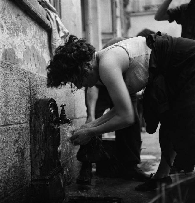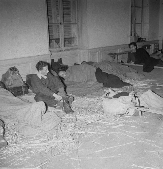 Les victimes des bombardements, désormais sans logement et qualifiées de « réfugiés » dans les textes de propagande, sont hébergées à Alençon. L’ancien hôtel particulier Masson sert de dortoir. Les conditions y sont précaires, reflet d’un pays occupé, frappé de pénuries depuis plusieurs années. Les femmes sont accueillies dans un autre lieu de la ville, qui reste à identifier. Un simple robinet pour plusieurs personnes… réalité ou mise en scène pour marquer les esprits ? N’oublions pas que chacun de ces clichés sert un discours de propagande.