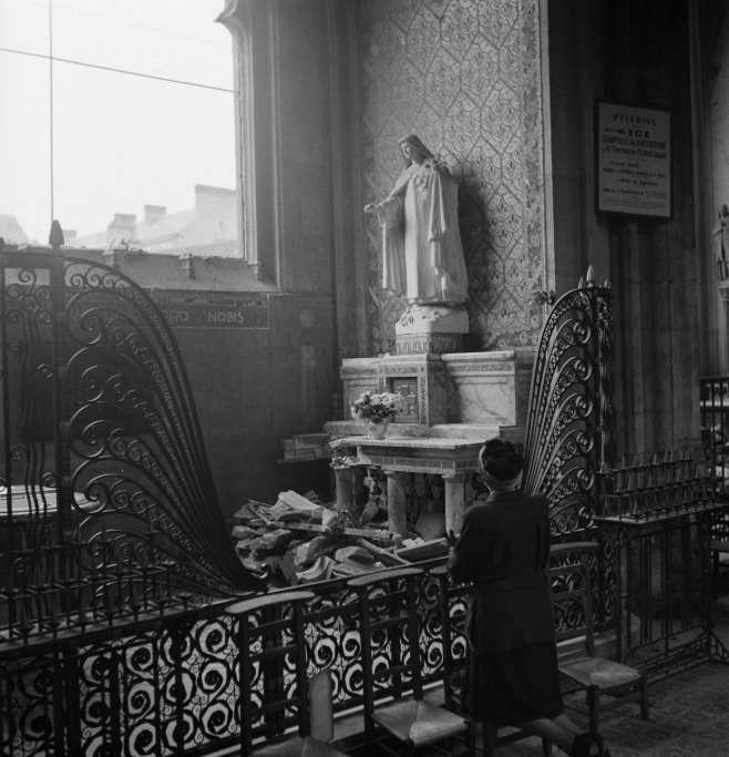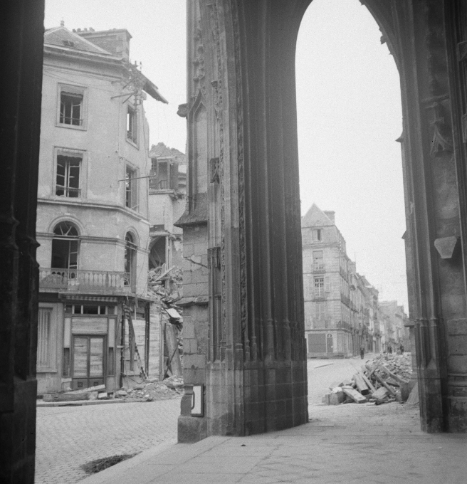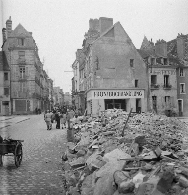 Pendant ce temps, André Zucca s’aventure en ville. La Grande Rue a subi des bombardements le 17 juillet 1944. Les gravats sont rassemblés sur les bords des voies. Sur l’ancienne Maison des Madelonnettes (un couvent des XVIIe-XVIIIe siècles), on distingue l’enseigne du Frontbuchhandlung (librairie de propagande et d’armée). En prenant du recul, sous le porche de l’église Notre-Dame, elle-même endommagée, la vue est saisissante.